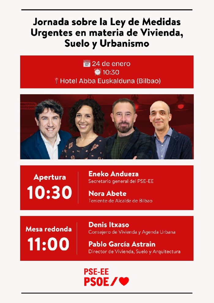El Secretario General del PSE-EE, Eneko Andueza, y la portavoz socialista y teniente de alcalde de Bilbao, Nora Abete, abren este sábado 24 de enero, a las 10.30 horas, la jornada de información sobre la Ley de Medidas Urgentes en materia de Vivienda, Suelo y Urbanismo que reunirá, entre otros, a los responsables institucionales socialistas en esta materia (alcaldes y alcaldesas, concejales y concejalas) del territorio de Bizkaia.